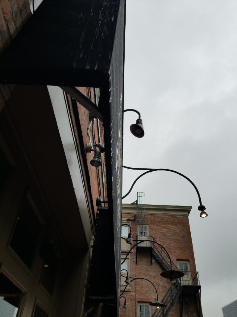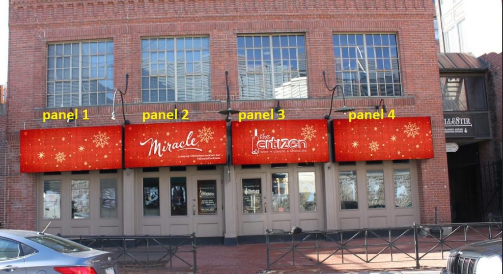 Problem: A local restaurant and cocktail bar was having a pop-up Christmas theme bar for the month of December and they wanted to transform their awnings to represent the Xmass Gift theme they had going on inside.